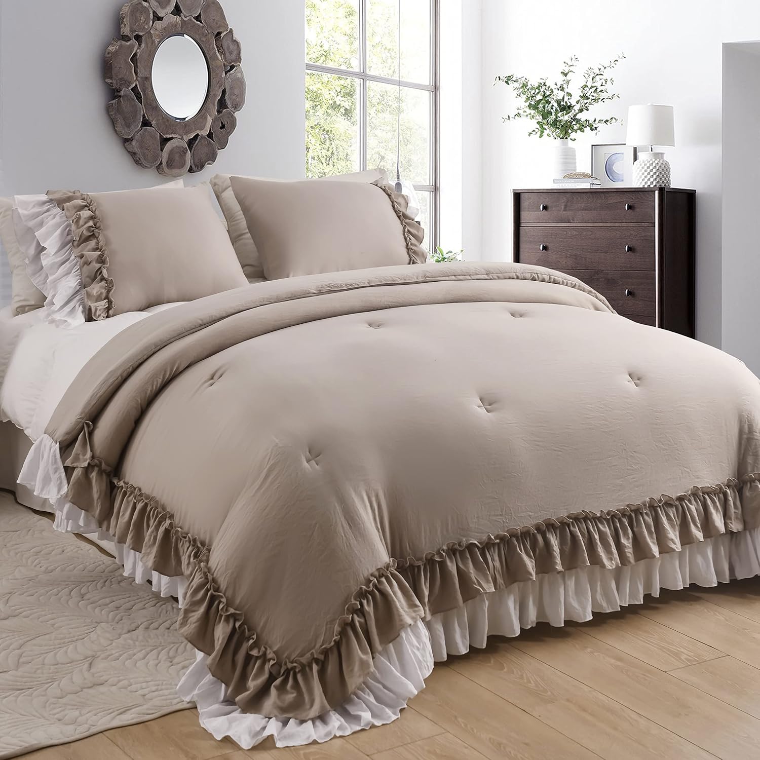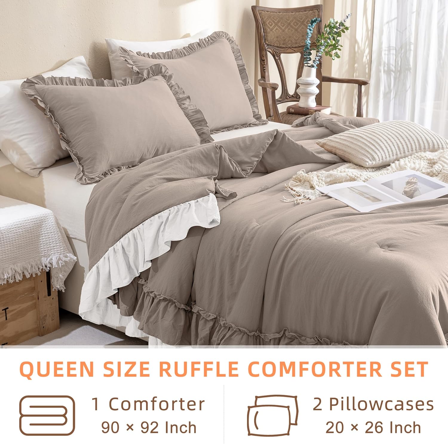 Taupe-white queen size comforter set brings you a comfortable feeling at your bedding time. Our Taupe-white bedding comforter sets not only makes the whole bedding look more stylish, but also can enhance the sense of your entire room. It is worth mentioning that our double ruffles are sewn on by hand, not by machine. That’s why our comforter set is more delicate than other normal comforters.