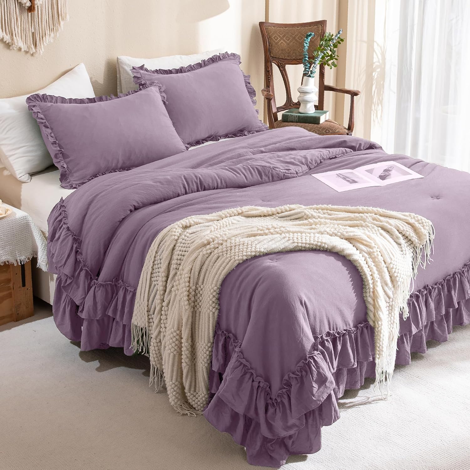 3 pieces queen & king size comforter sets. Available in ruffle comforter queen: 1 ruffled comforter (90 x 92Inch), 2 pillowcases (20 × 26 Inch); ruffle comforter king: 1 ruffled comforter (106 x 92 Inch), 2 pillowcases (20 × 36 Inch). Our comforter sets are a great choice to give to friends or for your own use.